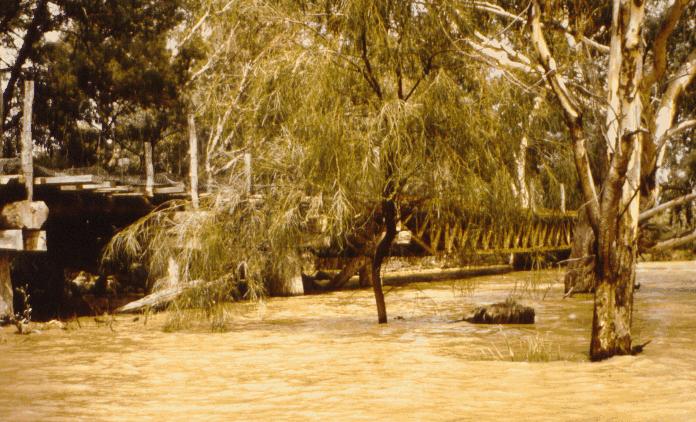 The weather had cleared and the ground was drying out very quickly with the warm conditions. Creeks that had been swollen with floodwaters and had cut roads were now empty. The bus crew reached Walgett just on dark and camped near the bridge. During the day Tony established radio contact with Perth and was advised that the crew in Escort had spent the previous night at Mungindi waiting for the boats. The crew in Rover and the bus were now aware that they were downriver of the boats.