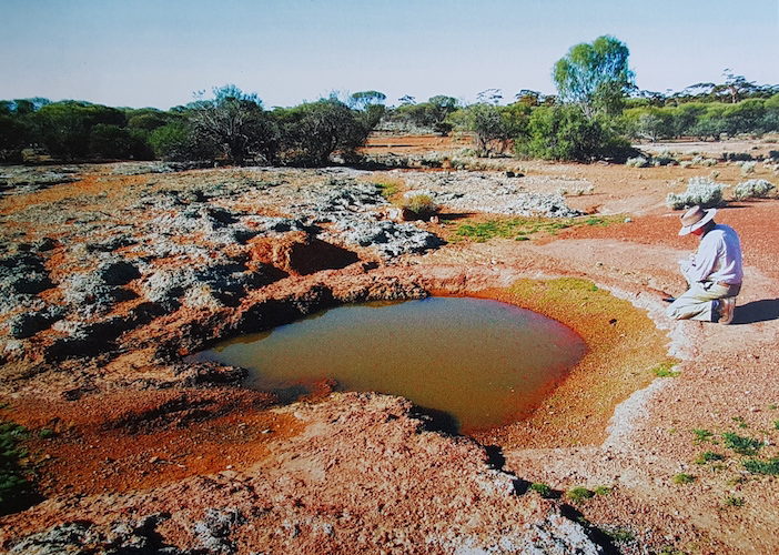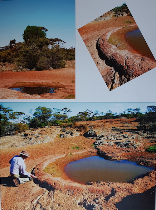 “According to Harper, the party crossed the range about 8 miles north-west of Mount Kennedy, and the continued on for another 5 or 6 miles. Therefore, I calculated that Jimbine must have been somewhere in the vicinity of 30o17’S, 119o35’E. Consequently Michael and I circumnavigated the Helena and Aurora Ranges to this approximate location on the northern side.  Finding nothing near the track we began a search on foot.  About 100 m east of the track, on scalling a low rise, we were astonished to find a clearing in the next valley that contained a natural well in the conglomerate sandstone, exactly as Harper had described it.