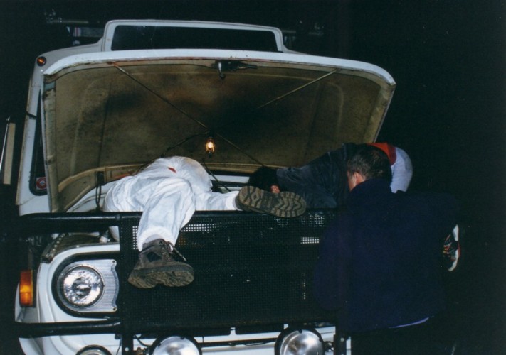 Heads were buried in engine bay, then whole bodies. The generator provided light. The diagnosis was a faulty fuel pump.