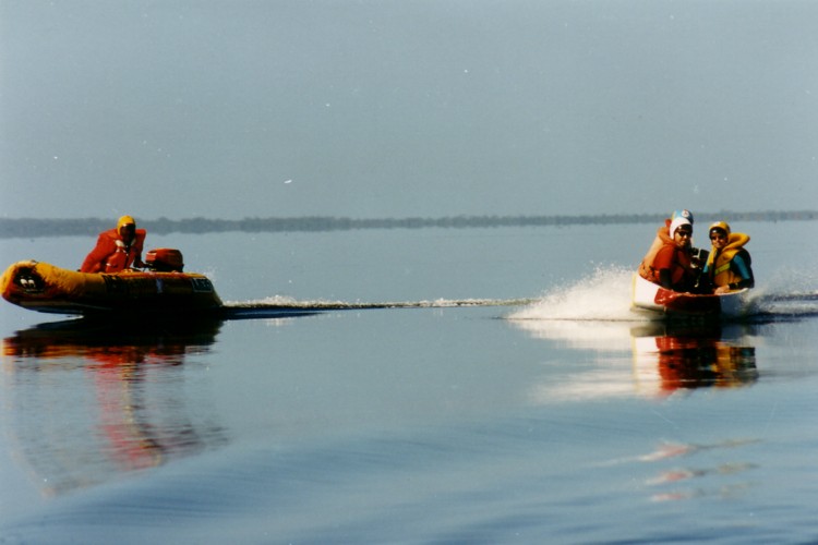 Five boats were on the water, two with three crew each. Cliff volunteered to stay behind at camp. The extra personnel meant the variables of engine power, boat carrying capacity and crew weight had to be juggled to get optimum performance. Eventually I ended up driving John’s boat with David navigating. Adrian and Scott teamed up, and Tony and John used Cliff’s inflatable. Greg’s oversized surfboard carried both chefs. Mike’s inflatable was the Press Boat.