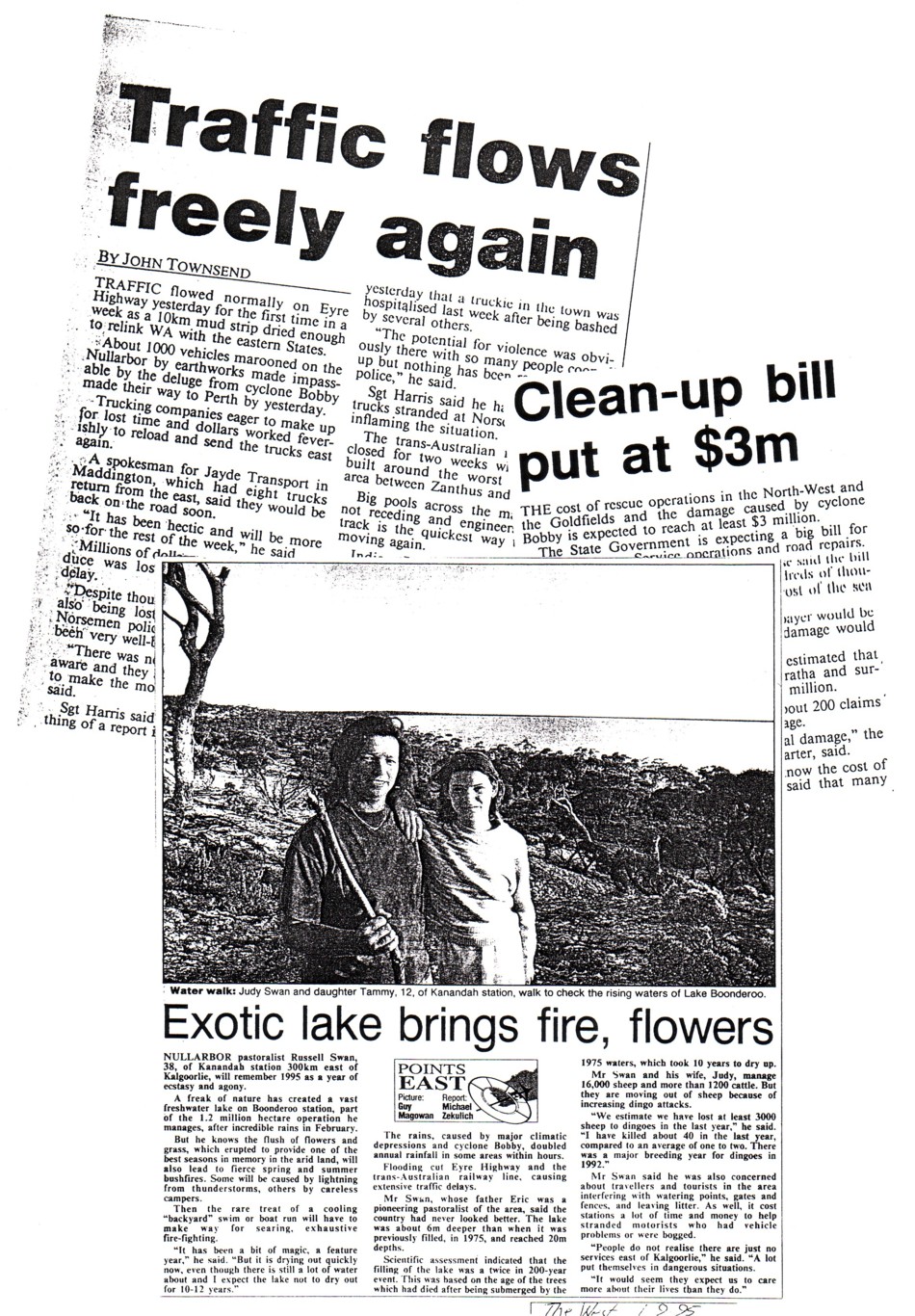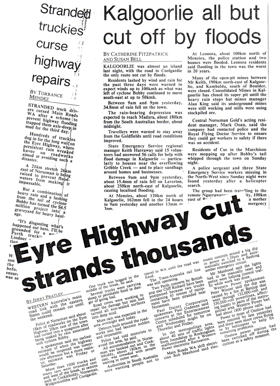 Cyclone Bobby smashed its way across Western Australia on 24 February 1995 and caused a great deal of damage. The accompanying rain caused floods through the eastern goldfields, inundated some mines and cut the Trans Australian Railway and Eyre Highway for many days. The result was many, many hundreds of thousands of dollars damage and loss to a wide section of the rural community.