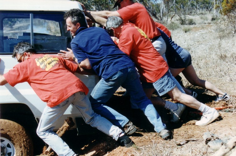 The next problem was to get The Bus to the diversion turnoff, a kilometre back to the west. There was insufficient room to turn around, complicated by the still-attached trailer. To attempt to turn around meant that it would have suffered the same fate as the Landcruiser – and it would have taken a lot more than half a dozen strong bodies to push it out. We removed the trailer and attached it to the 4WD. The Bus was the reversed the kilometre or so to the intersection.
