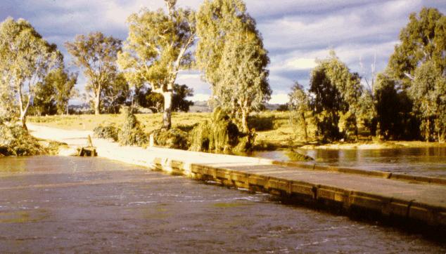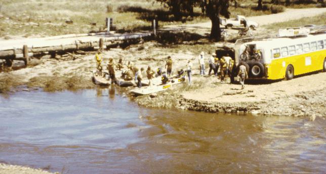 The weather had been hot and humid all day. The crew in the bus arrived at Yelarbon and a few kilometres out of the town found their way blocked by the flooded Mackie Creek. Bob unloaded the Yamaha motorbike, brought for just such an occasion, and headed off towards Sunnybrook to attempt contact with the boat crews – not realising that they would not be arriving. After a marathon effort – all to no avail – he returned to the bus where Ted was waiting.