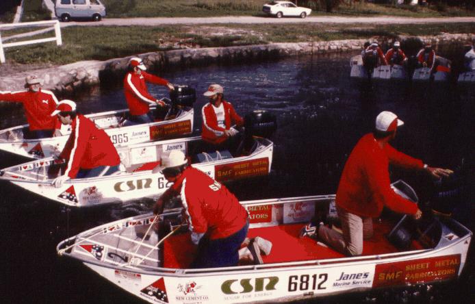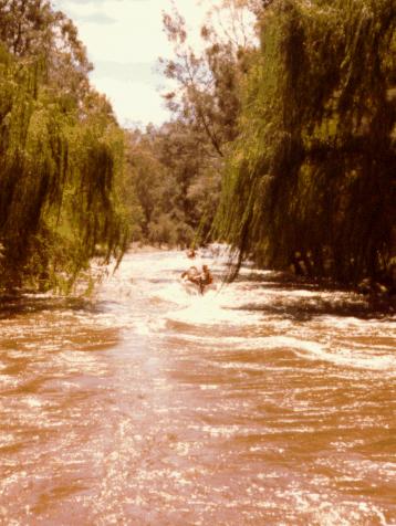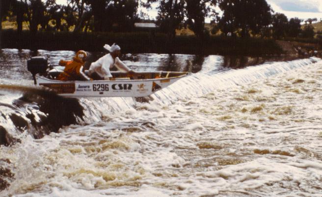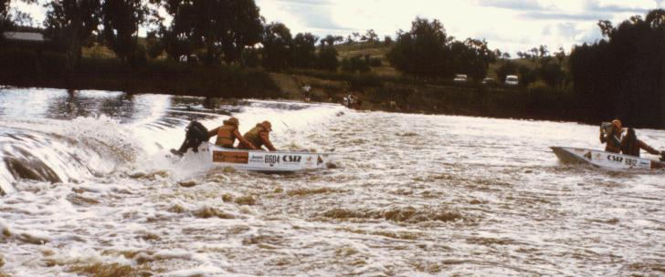 After a dash down the rocky-bottomed Mole River the boat crews sped out into a flood swollen Dumaresq River (headwaters of the Darling River).