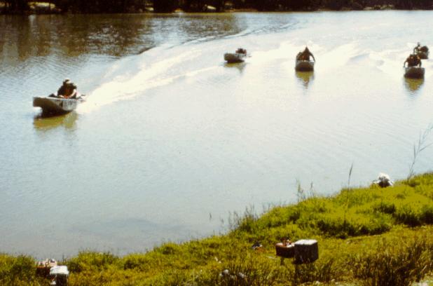 The advice from the Shire Clerk was heeded and five boats portaged around Bourke Weir in the early morning gloom. Ted showed everyone the best method of roping a dinghy down flowing water.