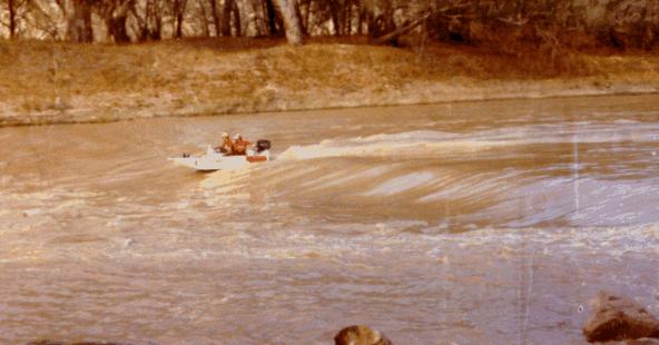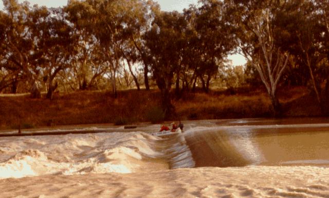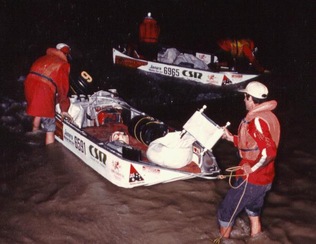 Mario and Tony were despatched in Rover to complete the first refuelling operation. The remainder of the support crew and the team from Overlander magazine remained at Bourke Weir until it was light enough to film and photograph Steve and Bob, in the sixth boat, as they shot across the top of the weir and through the stoppers.