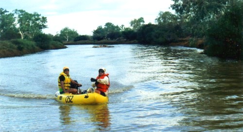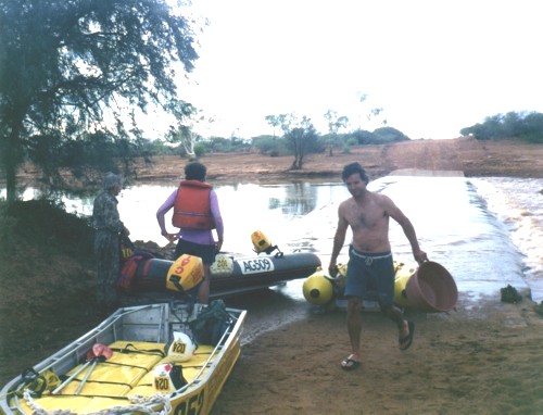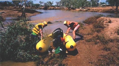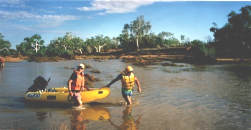 Mike Lenz and Cameron Wilkie made an exploratory trip down river to ascertain water depth and to ensure the suitability of this crossing as a starting place for the Murchison River Expedition.