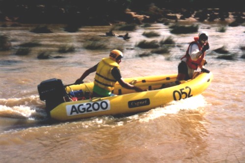 The repair kit was hauled out and after an hour of cutting, gluing and patching (and then waiting for it to dry) the stricken duck was ready for a test run. Thirty minutes downriver it was evident that the pontoon was losing air. The repair began to open. As it became worse a decision was made to rearrange the crew to lighten the load so planing speed could be maintained.