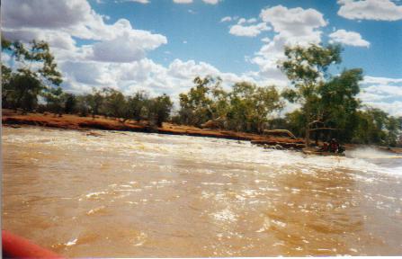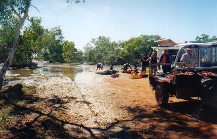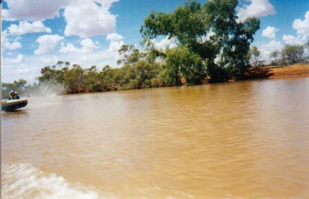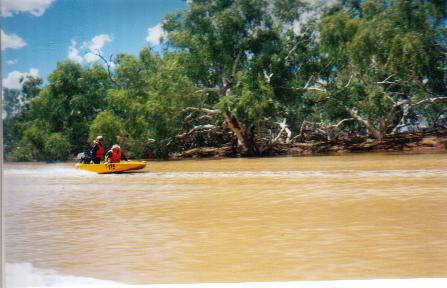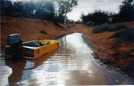 We waited 90 minutes at the rendezvous for the Boat Crew. They were trying continually to raise us on the satphone but were unable to establish a connection to the network provider. The satphones were next to useless. It was hot, the flies were bothersome and there was precious little shade. Eventually the satphone rang. After a frustrating conversation with Kevin, I established the locstat of the Boat Crew and then drove 600 metres cross country to the rendezvous. From this point, six kilometres upstream from the Manfred Crossing, it is 60 kilometres downriver to Minnawarra Crossing, the next accessible point (a full day in most power dinghy races). I was very uneasy about leaving the Boat Crew to their fate but there was no alternative.