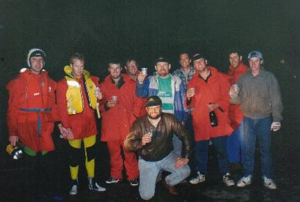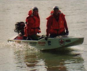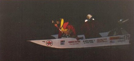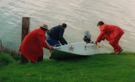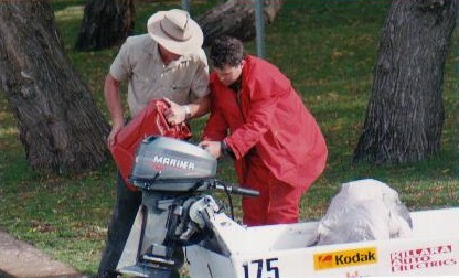 On land it was a waiting game. The Lock Keeper kept the barrage open till dark, at which time he departed. Under pressure I agreed to start a search. Barely had it got underway when The Bus crew (who had gone to the main town jetty) saw the light from a torch carried by the boat crews. They were guided to the barrage. The crews were cold, wet, tired and reluctant to continue to the mouth of the river, a further seven kilometres. Tony’s ploy of threatening to get in the boat himself got Peter and Michael back into the boat with a battery, spotlight and torch to make the run to the mouth, and return five kilometres to the boat launching ramp.