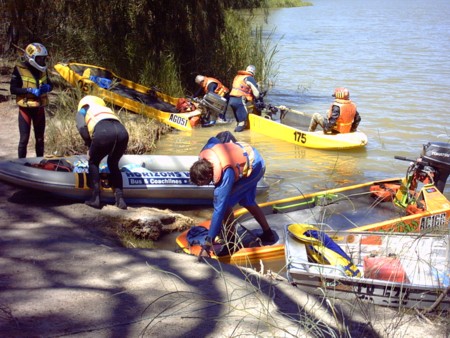 On one corner Todd and Ian nearly flipped their boat. They caught a wave and Ian fell out. He looked pretty wet when we came by. After that they relieved the boredom by standing up in their boat.