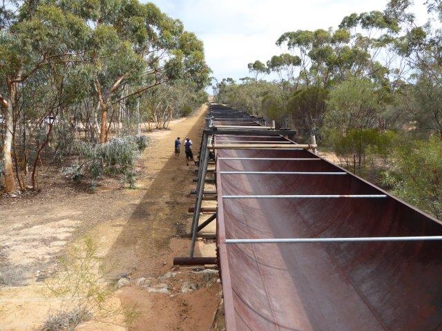 The water harvesting system ingeniously uses two huge granite outcrops. A stone dam wall was built around the perimeter of each rock and water flowing off the rock was caught by the wall, directing it into a stone-lined sluice that sent it to a large earthen reservoir before travelling cross county in a steel aqueduct and an earth channel. The clever design of this system means very low annual rainfall (only 250mm per annum) results in substantial runoff – enough to fill Karalee with 48 million litres. The water collected in the dam was piped to an overhead tank 3.6 km to the south near the railway station. Karalee continued to supply water until the introduction of diesel locomotives in 1953.