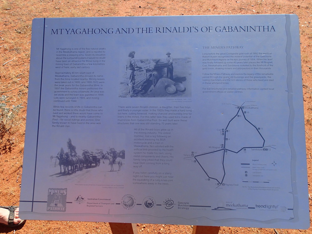 Mt Yagahong is one of the few natural peaks in the Meekatharra region and is reputed to resemble an emu. The local aboriginal people, the Yugunga Nya group, believe the hill represents an emu with part of its side ripped away during a dingo attack.