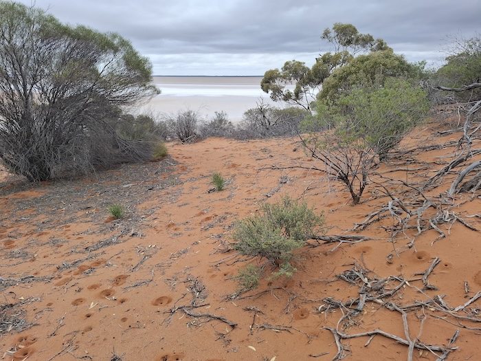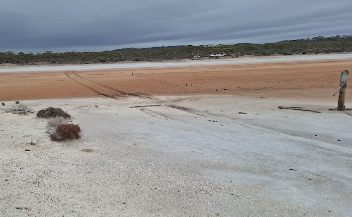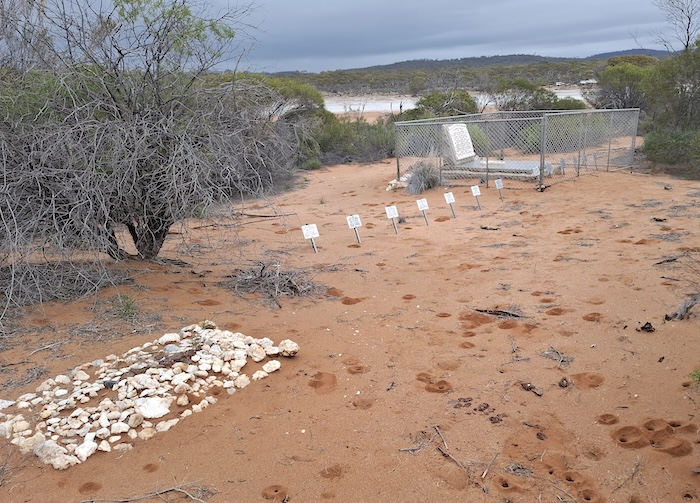 Its gazetted location is at 31.478272S 121.583090E / 31° 28′ 41.7792″ S 121° 34′ 59.124″ E, however, locals got tired of digging graves in rock at this official, gazetted location and, unofficially, moved the cemetery to a sand island in Lake Lefroy about 150 metres offshore. Very ‘Widgie’.