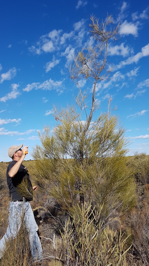 Craig preparing to attach flagging tape to a desert oak