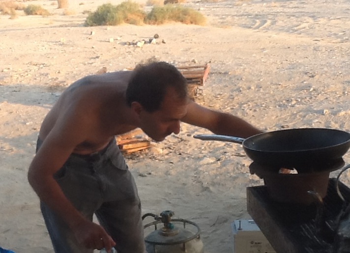 - Ohad, Ehud and Nimrod watching Ofer making coffee. Ein Bokek in the background.