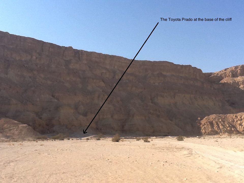 On exiting the makhtesh Ofer and I drove along Wadi Nekarot, heading to Sapir Pool and then camp. We took time to get a size comparison of the wadi cliffs. (see the following photograph).