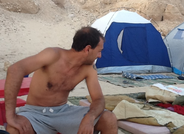 - Ohad stretching after a strenuous first day.