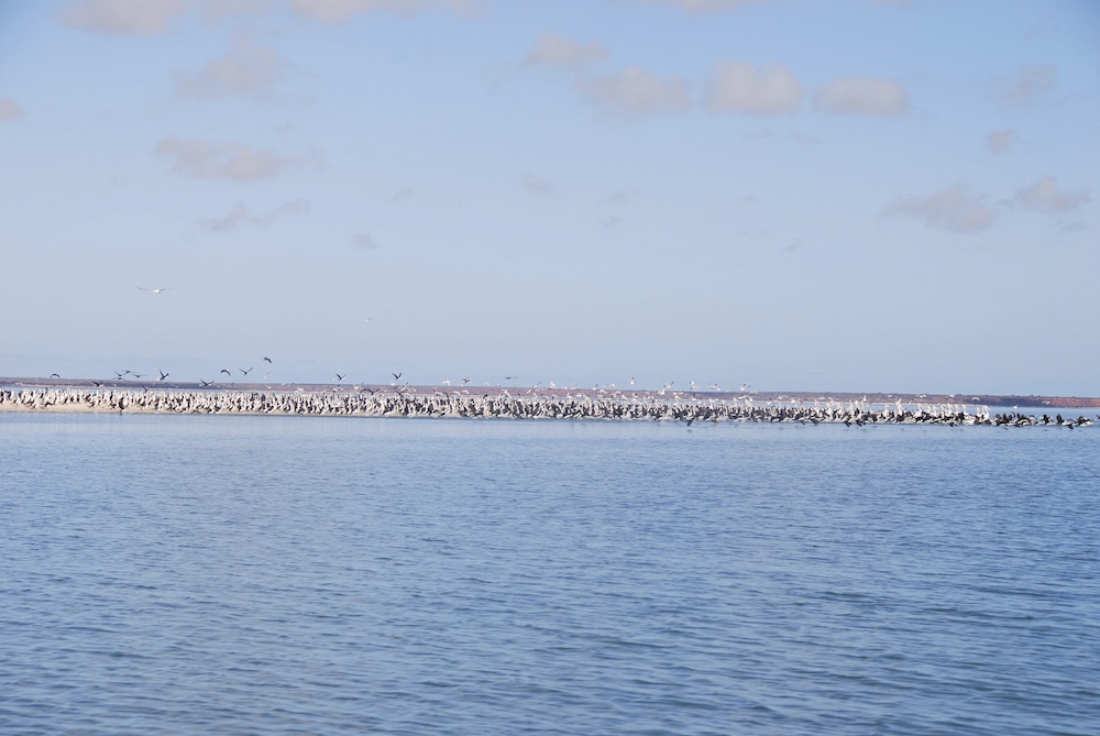 We decided to head around to Herald Bight in the inflatable to do a bit of fishing in the creeks. We rounded the Bluff and headed towards a sand spit. There were hundreds of pelicans, shags and gulls on the spit.