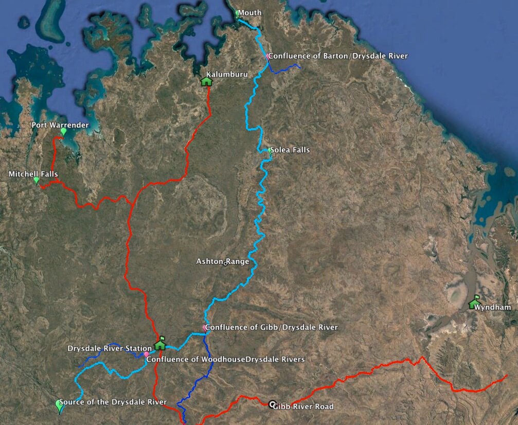 The Drysdale rises in the Caroline Range. At 435 kilometres in length it is the third longest river in the Kimberley. From its source it flows north-east across the extensive Gardner Plateau then turns north and cuts through the Ashton Range before emptying into Napier Broome Bay. The middle length of the river is through the Drysdale River National Park.