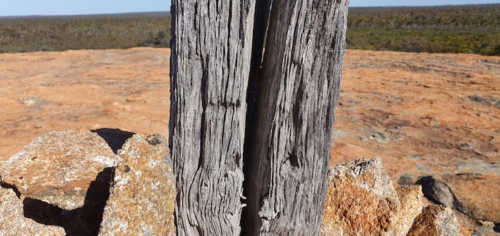 [In 2022 a government agency pushed through a track close to this oddity of the Australian bush – possibly the Dept of Agriculture to allow ease of access for the local dogger – the result of which was destruction of the Hermit’s Hut.]