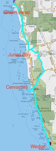 The fishing and holiday town of Cervantes got its name from Cervantes Island two kilometres offshore to the south-west, which in turn got its name from an American whaling ship of the same name that was wrecked here. Read more,