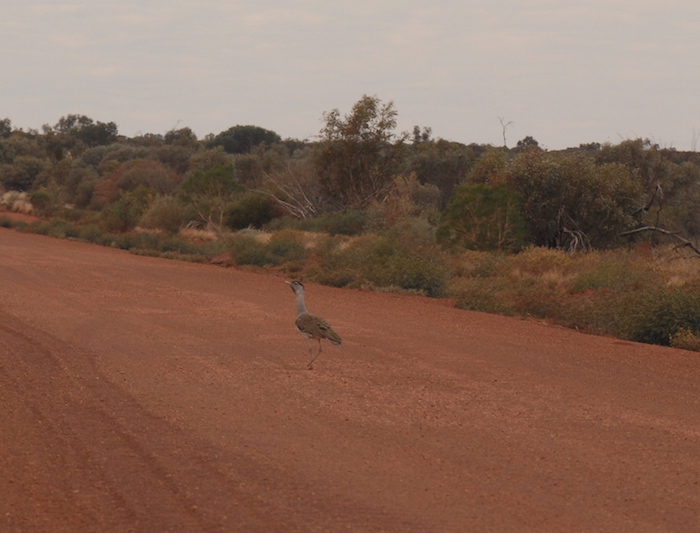 I had just taken off from photographing a wrecked vehicle when I noticed an Australian Bustard crossing the track.