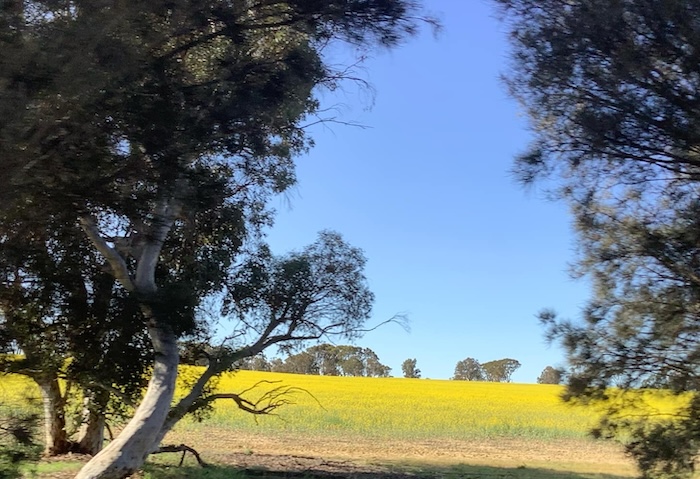 - The canola paddocks were just starting to turn yellow.