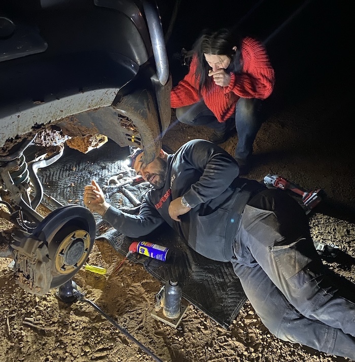 - Scott and Zsuzsanna in Scott’s heavily-modified Patrol.
