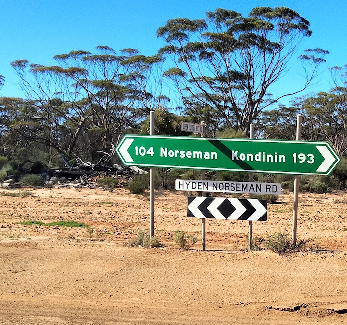 - The sign at the intersection of Hyden Norseman Road and Victoria Rock Road is in error. It is 193 kilometres to Hyden not Kondinin. Photo Kim Epton.