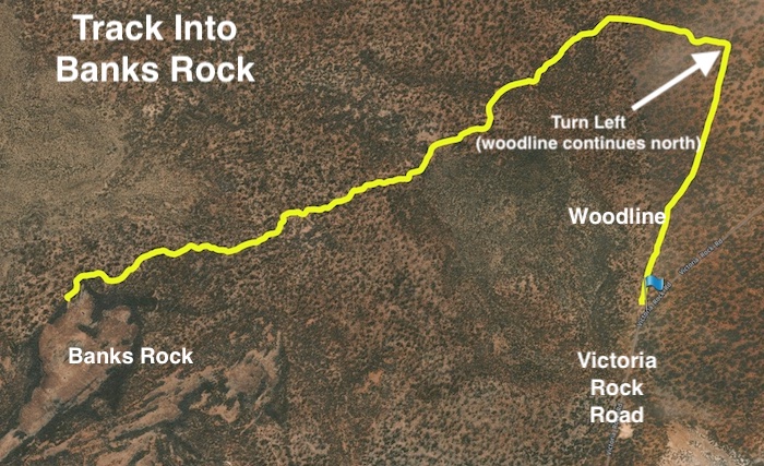 The track into Banks Rock is not immediately obvious and does not lead directly off Victoria Rock Road. It’s a very twisting, turning track.