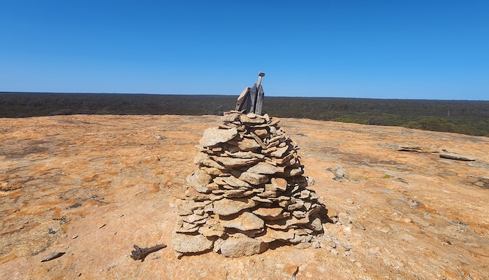 - Official survey cairn at the summit of Yerdanie Rock. This granite outcrop was an important feature for early explorers and, later, hopefuls making their way to the Goldfields.
