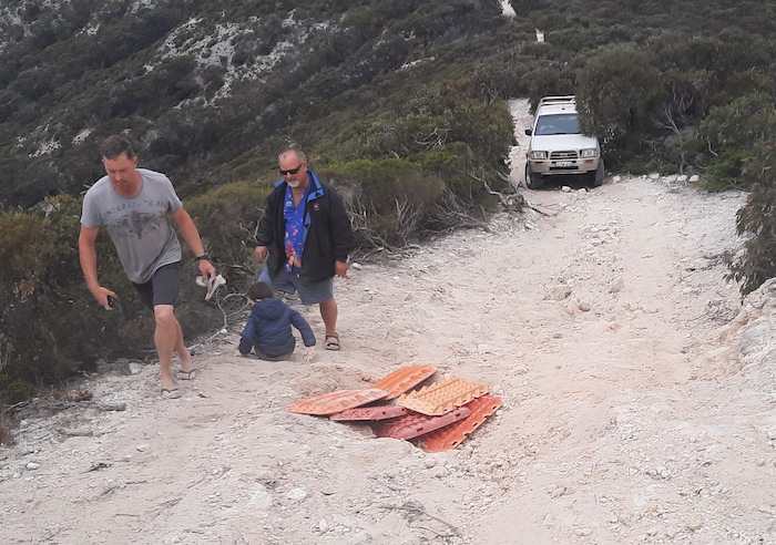 Nine hundred metres from the bluff itself and three hundred metres from a ‘turnaround point’ the Track narrows, rises sharply and turns on this rise. The reward for not making the turn correctly is driving over the edge of the spine. It is wise to have a spotter at this point to direct vehicles safely.