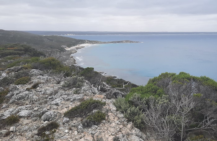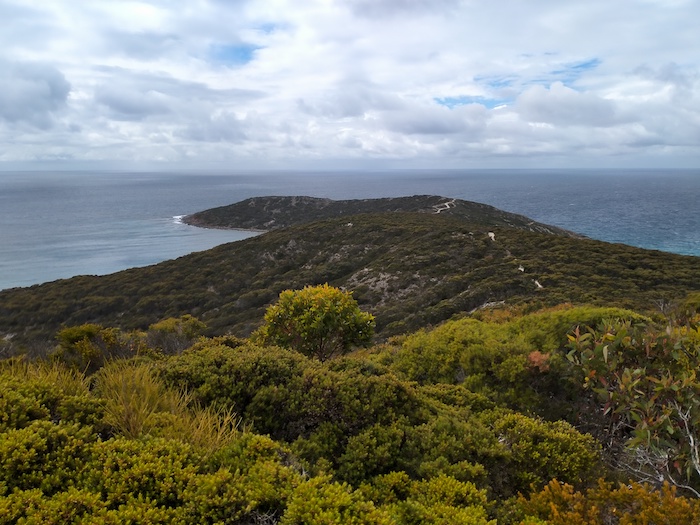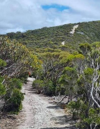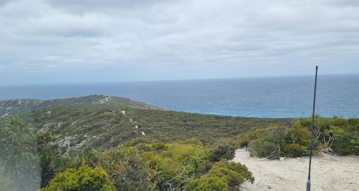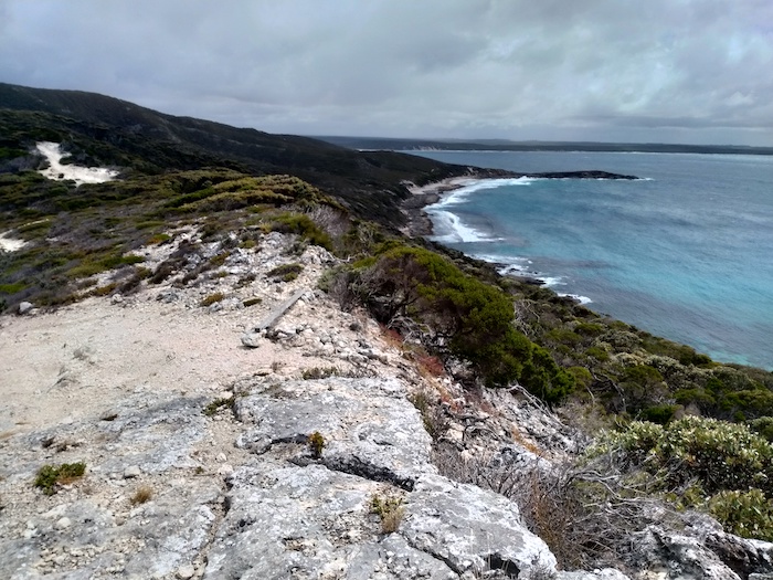 The Groper Bluff Track leaves Pallinup Road about 2.5 kilometres before Pallinup Beach. The first 2.5 kilometres of the Track, while bumpy, and in places closely vegetated, is reasonably easy.