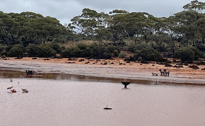 - Quirky art in a flooded claypan. Animal figures made from gum boots.