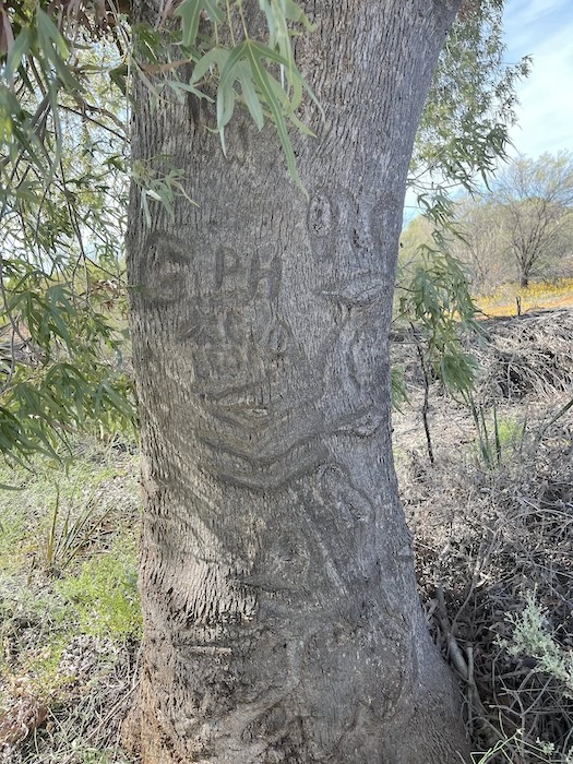 While this tree, about six kilometres before/after the railway depending on direction of travel, is easy to spot it is difficult to discern what has been blazed into its trunk.