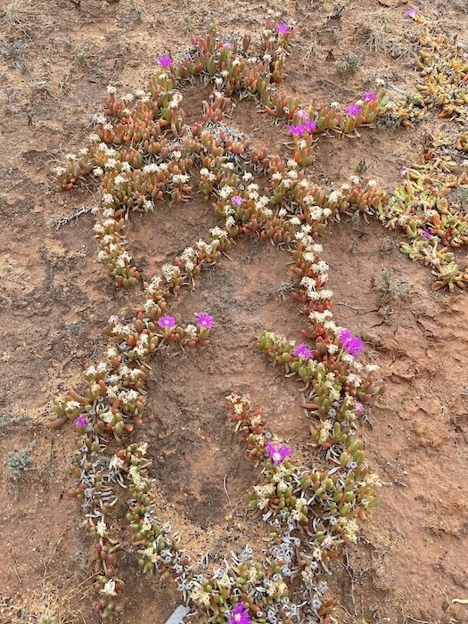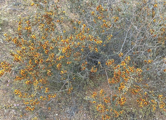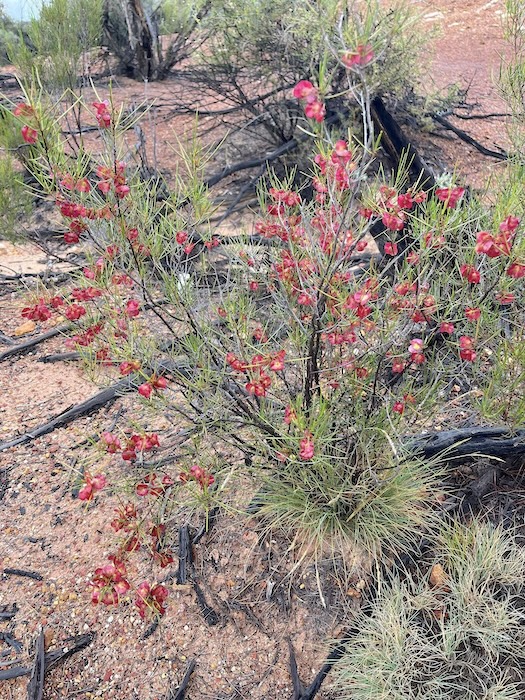 At the Trans Line the dirt track parallels the railway east for just under two kilometres before turning left at the crossing. Over the line the track continues east for about 200 metres before veering away to the north-east to an interesting Kurrajong tree.