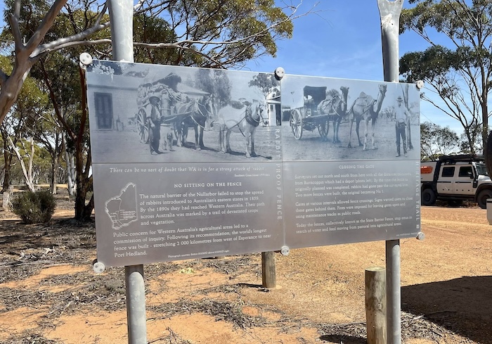 Along the way we stopped at Hunt’s Burracoppin Well, last refurbished in 2021. Just a short distance east of the well is an Interpretive Site for the historic Rabbit Proof Fence.