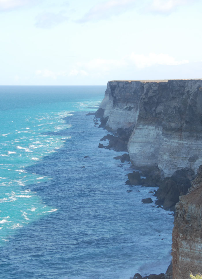 The Bunda Cliffs extend 200 kilometres between the Head of the Bight and the Western Australian border. They rise 60m to 120m from the level of the Southern Ocean and the claim that they are the most spectacular, awe inspiring cliffs in the world has credence.