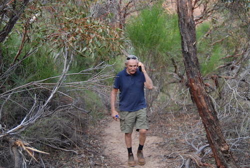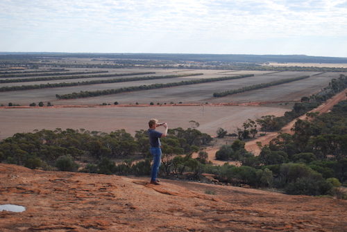 - Andrew on top of Elachbutting Rock. The rows of trees across the paddock in the background are part of a farming practice known as ‘alley cropping ‘.