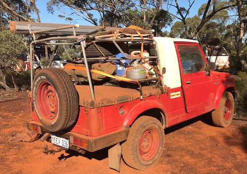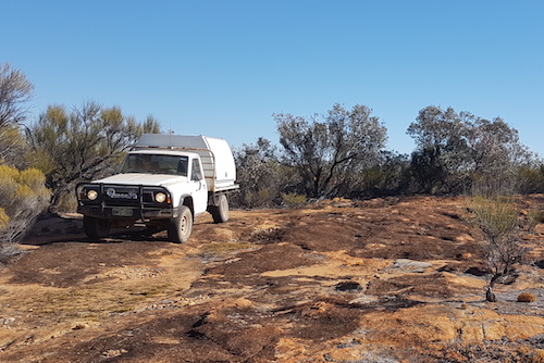 Progress towards our destination stopped in the middle of the afternoon. The track disappeared at a rocky outcrop. Despite forays to the north along the base of the rock in the Jimny by Scott and Joe and investigations to the east on foot, the continuation of the track remained elusive. A camera-equipped drone would have been useful.