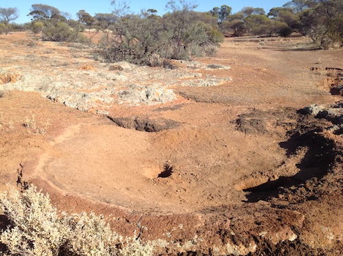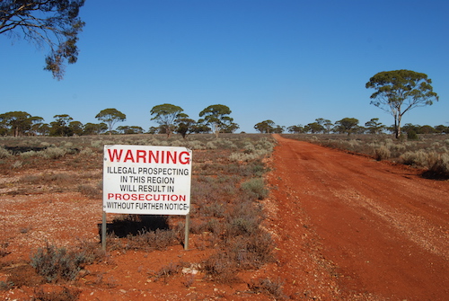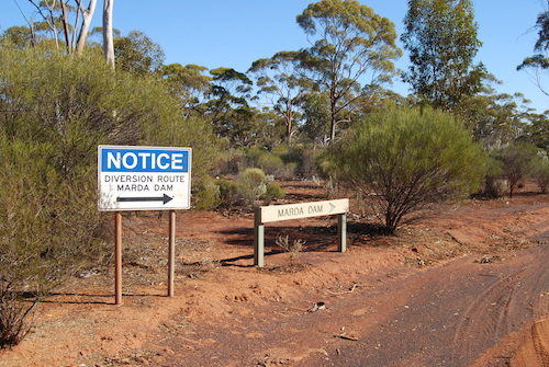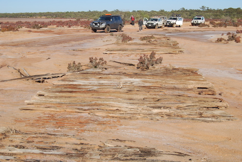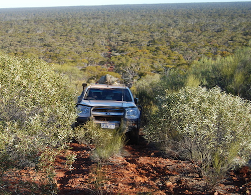 The track west brought us to a mine haul road. Triple road trains transport iron ore from Cliffs Natural Resources mine sites at Mount Jackson and Windarling (25 kilometres further north) to Koolyanobbing from where it is railed to Esperance for export.