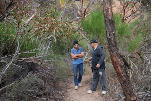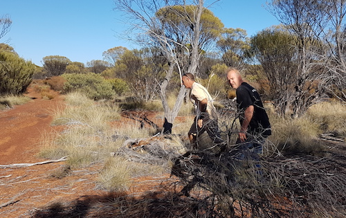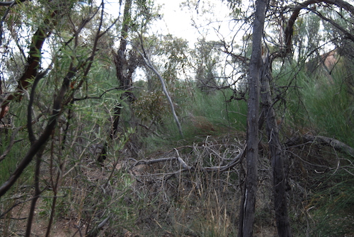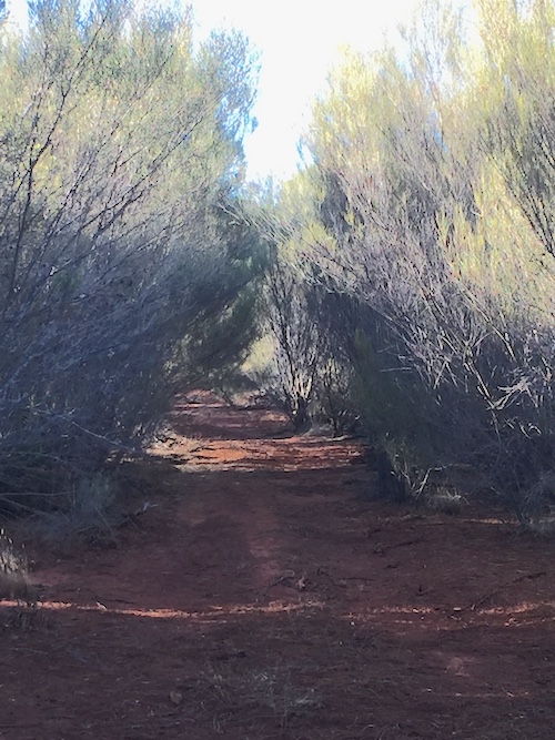 We left the designated Helena and Aurora Camping Area and located what we believed was the access track to Jimbine. After only a very short distance it was clear that the track had not been used for many years. It was very overgrown and there was no certainty that it would lead to the rockhole. It was more than likely a ‘shot line’. I was fairly confident that no one had been to the rockhole on this track since Lesley and Michael Brooker’s ‘re-discovery’ of it in 2008. Read more here.