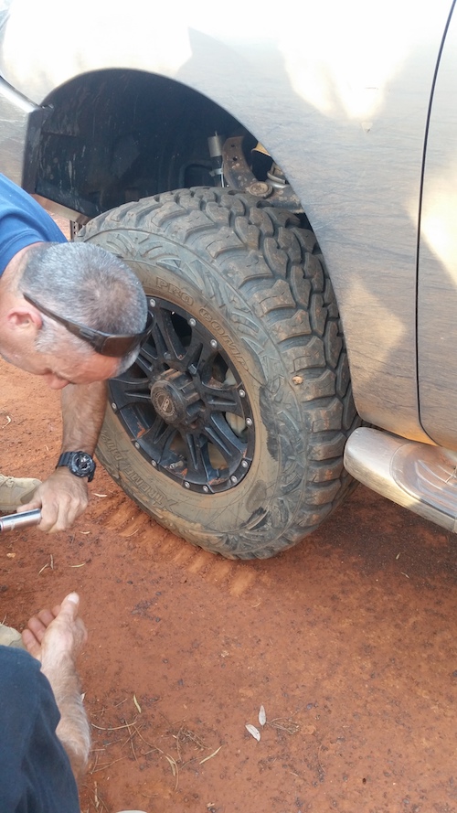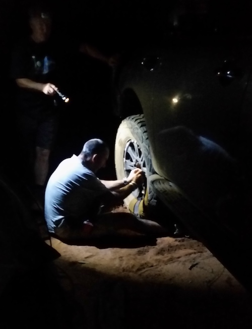Joe was in the lead and immediately on descending the ridge he was on the radio saying that his vehicle had a flat. The tight, constricting conditions made it more difficult than normal to change the wheel.