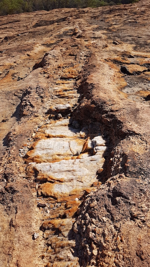 On my way down the rock I found a quartz interstice, common in granite rock outcrops in south-west Australia. They are formed when disparate liquid rocks cool at different rates. This one was of interest because of its unusual width.