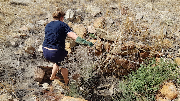 - Nicole removing weeds at Burracoppin Well.