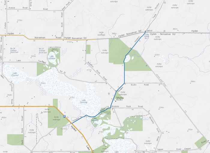 - Our trek started at the Hyden-Lake King Road intersection.