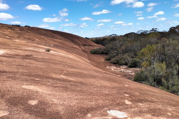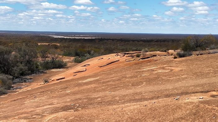 McDermid Rock is 2.6 kilometres south-west of the intersection of Victoria Rock Road and Hyden-Norseman Road. Although we had climbed many times in the past we considered the view from the top to be worth the effort.