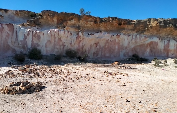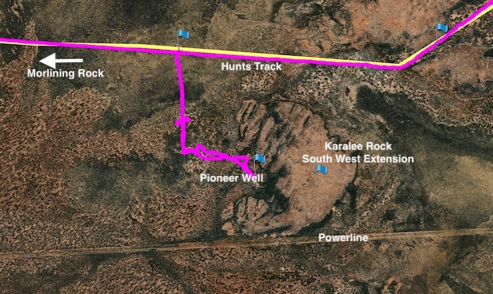 We left Southern Cross and refuelled at Yellowdine before turning in to the pumping station at Karalee. A newly-made track allowed access to the Hunt Track adjacent to Morlining Rock. Two kilometres east we located a very overgrown track that took us south towards the south-west extension of Karalee Rock where I had pinpointed a pioneer well from reference to satellite images. The drive in was tough and once adjacent to the predicted position of the well we got out of the vehicles and walked to the well.