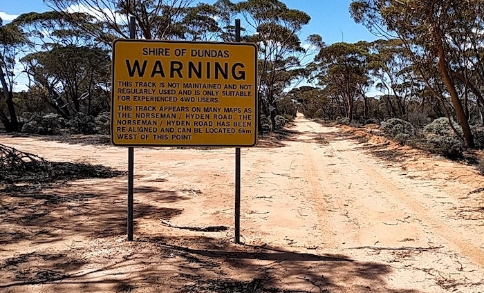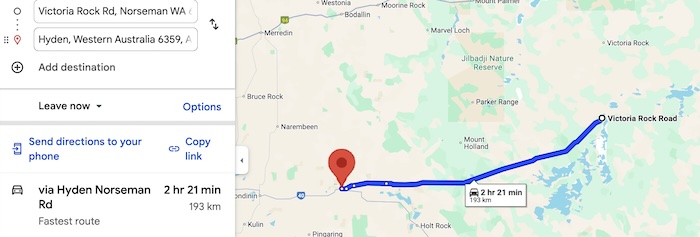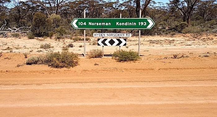 The directional/informational sign at the intersection of Hyden-Norseman Road and Victoria Rock Road is incorrect albeit ultimately helpful. The distance to the next available fuel is correct. However, it is at Hyden, not Kondinin.